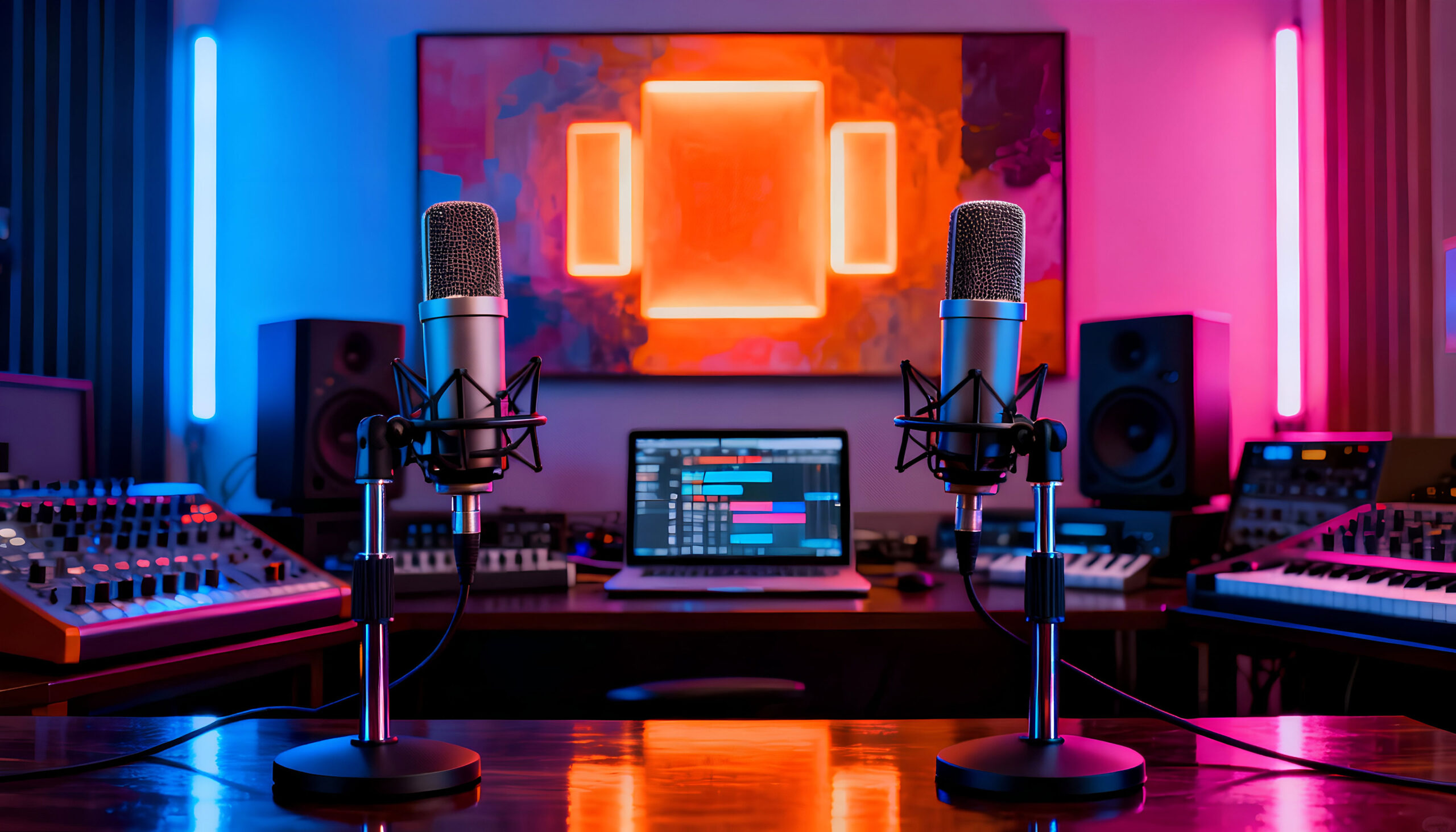 Our studio includes professional-grade microphones, cameras, lighting, sound panels, and editing workstations — everything you need to produce a broadcast-quality show.